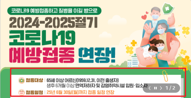 - ✅ 65세 이상 및 면역 취약층 → 코로나 예방접종 비용 무료